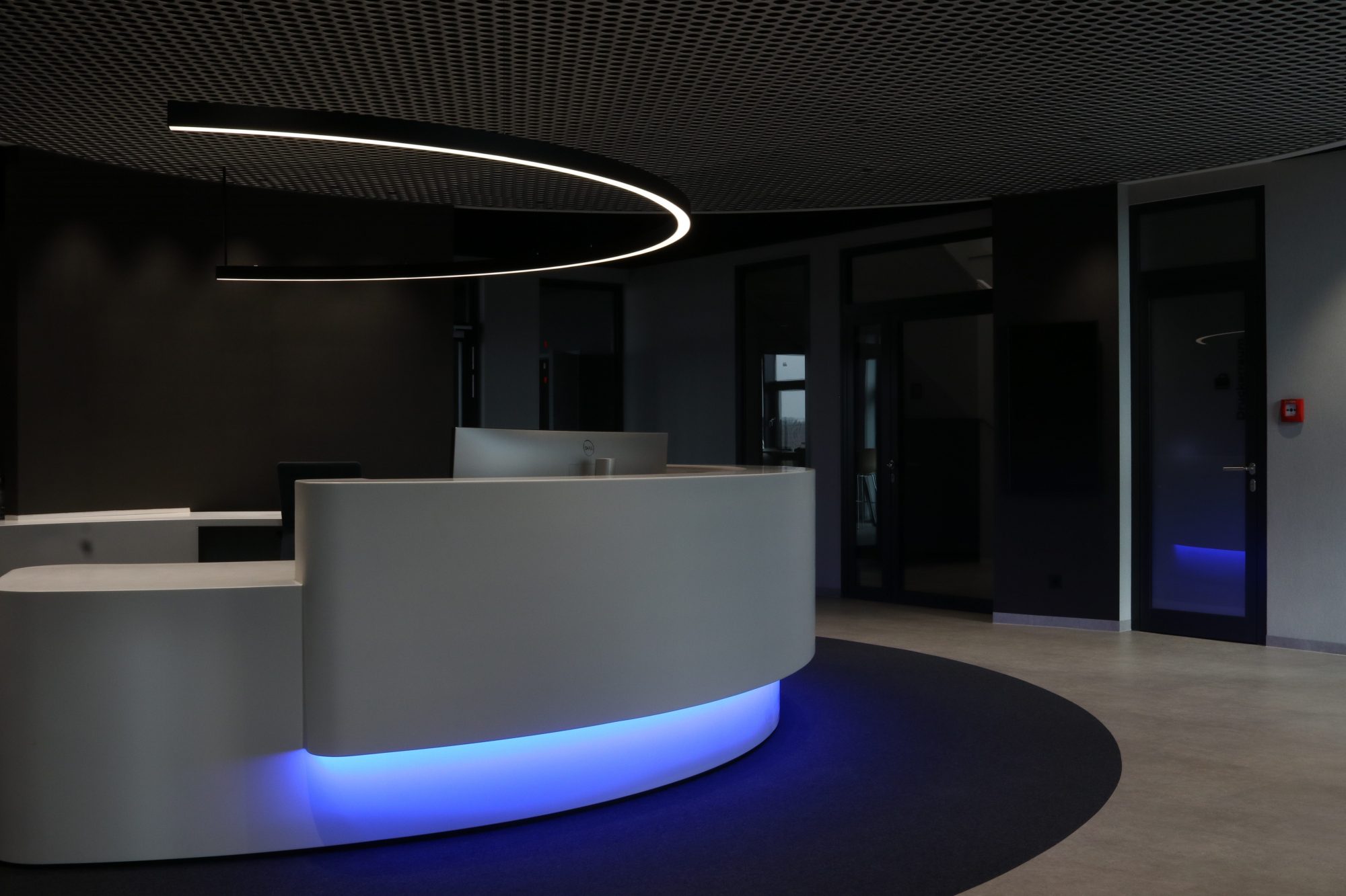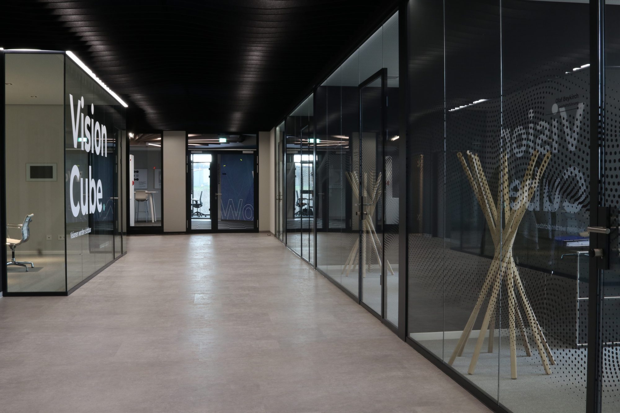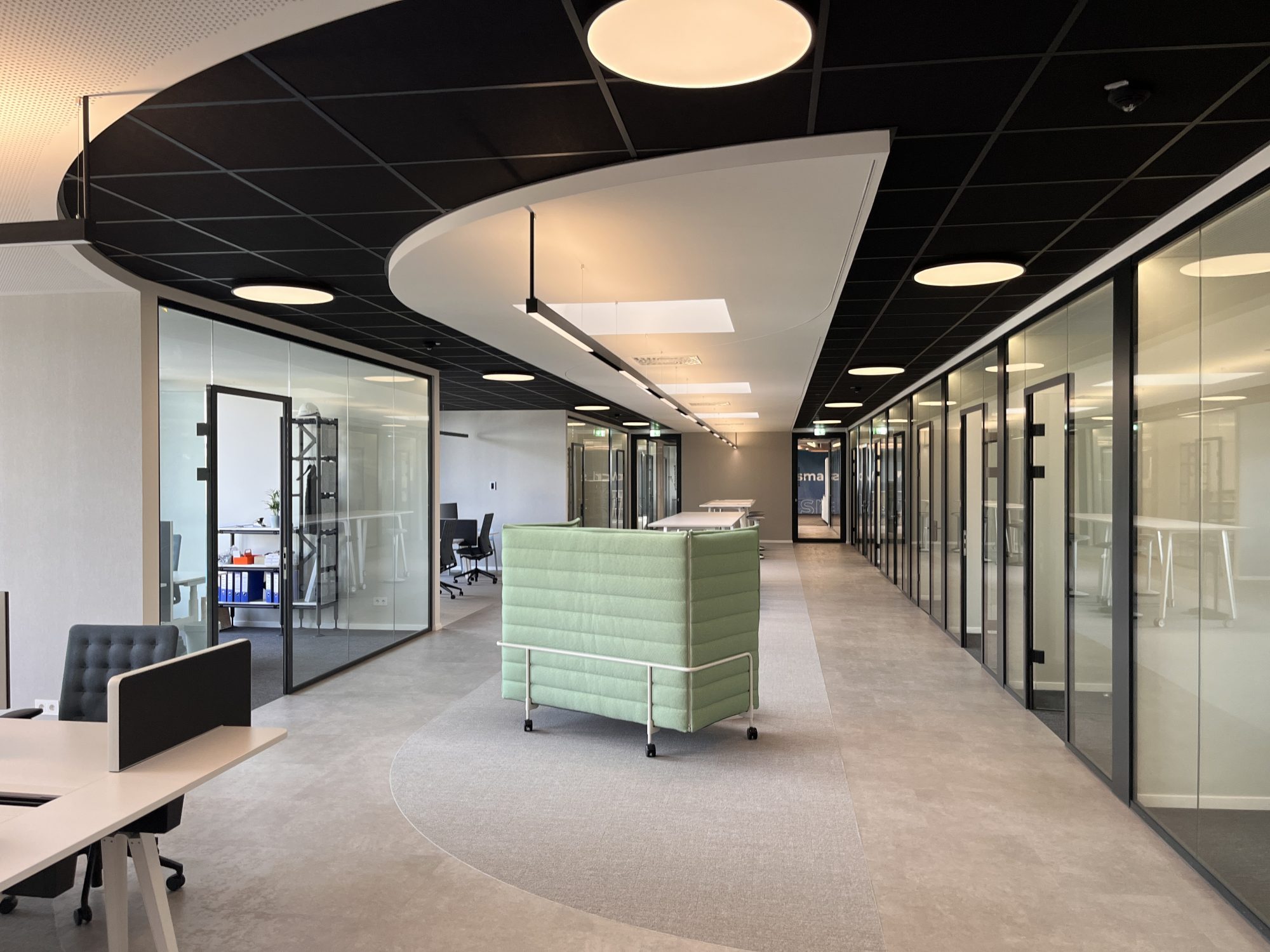 Ein besonderer Fokus lag auf der Integration energetischer Aspekte – sowohl in der Bauweise als auch in der technischen Ausstattung und Automation. Die senkrechten Verschattungslamellen entland der Straßenseite fungieren nicht nur als effektiver Sonnenschutz, sondern auch als dynamische Medienwand, die individuelle Inhalte projiziert. Im Inneren präsentiert sich eine moderne Arbeitsumgebung, in der die Büros den Arbeitsprozessen entsprechend gestaltet wurden, um eine zeitgemäße und ergonomische Atmosphäre zu schaffen.