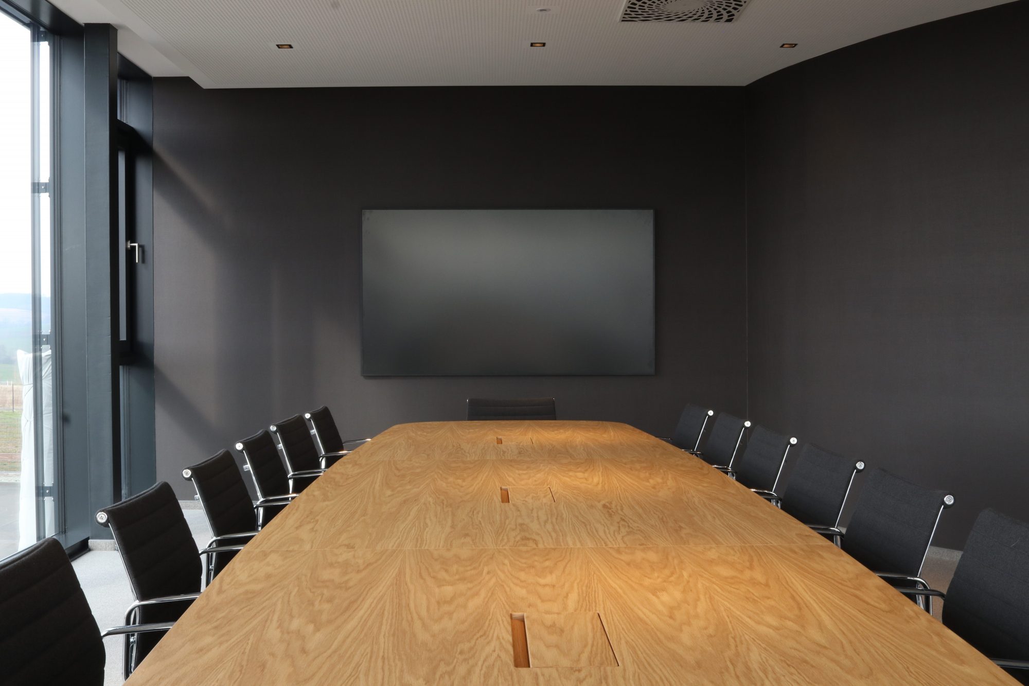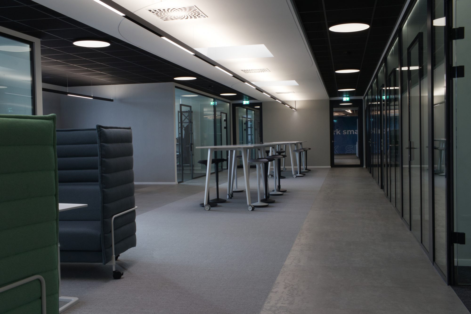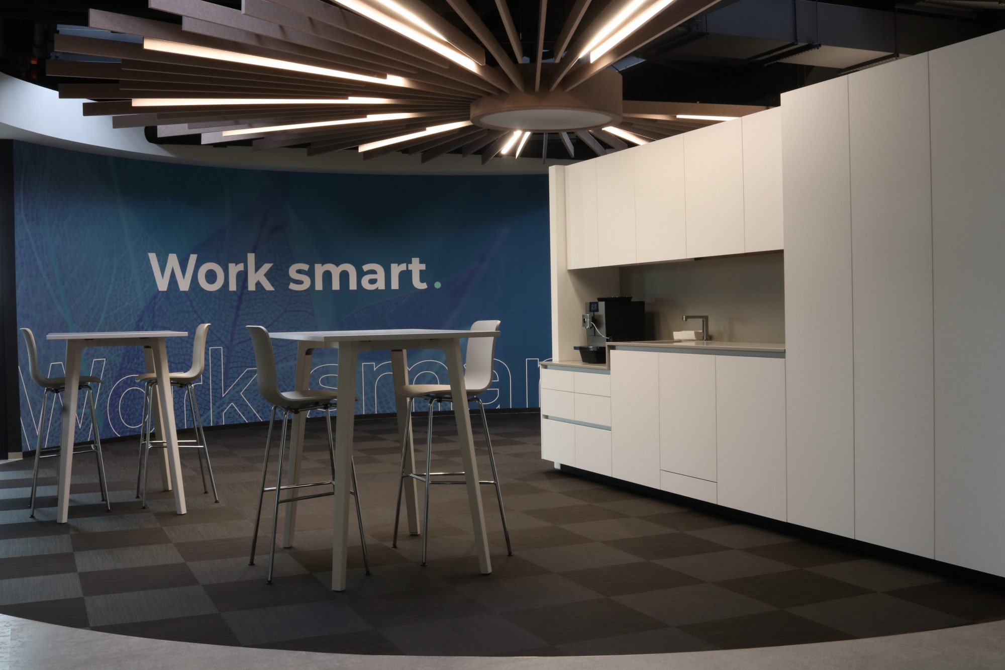 Ein besonderer Fokus lag auf der Integration energetischer Aspekte – sowohl in der Bauweise als auch in der technischen Ausstattung und Automation. Die senkrechten Verschattungslamellen entland der Straßenseite fungieren nicht nur als effektiver Sonnenschutz, sondern auch als dynamische Medienwand, die individuelle Inhalte projiziert. Im Inneren präsentiert sich eine moderne Arbeitsumgebung, in der die Büros den Arbeitsprozessen entsprechend gestaltet wurden, um eine zeitgemäße und ergonomische Atmosphäre zu schaffen.