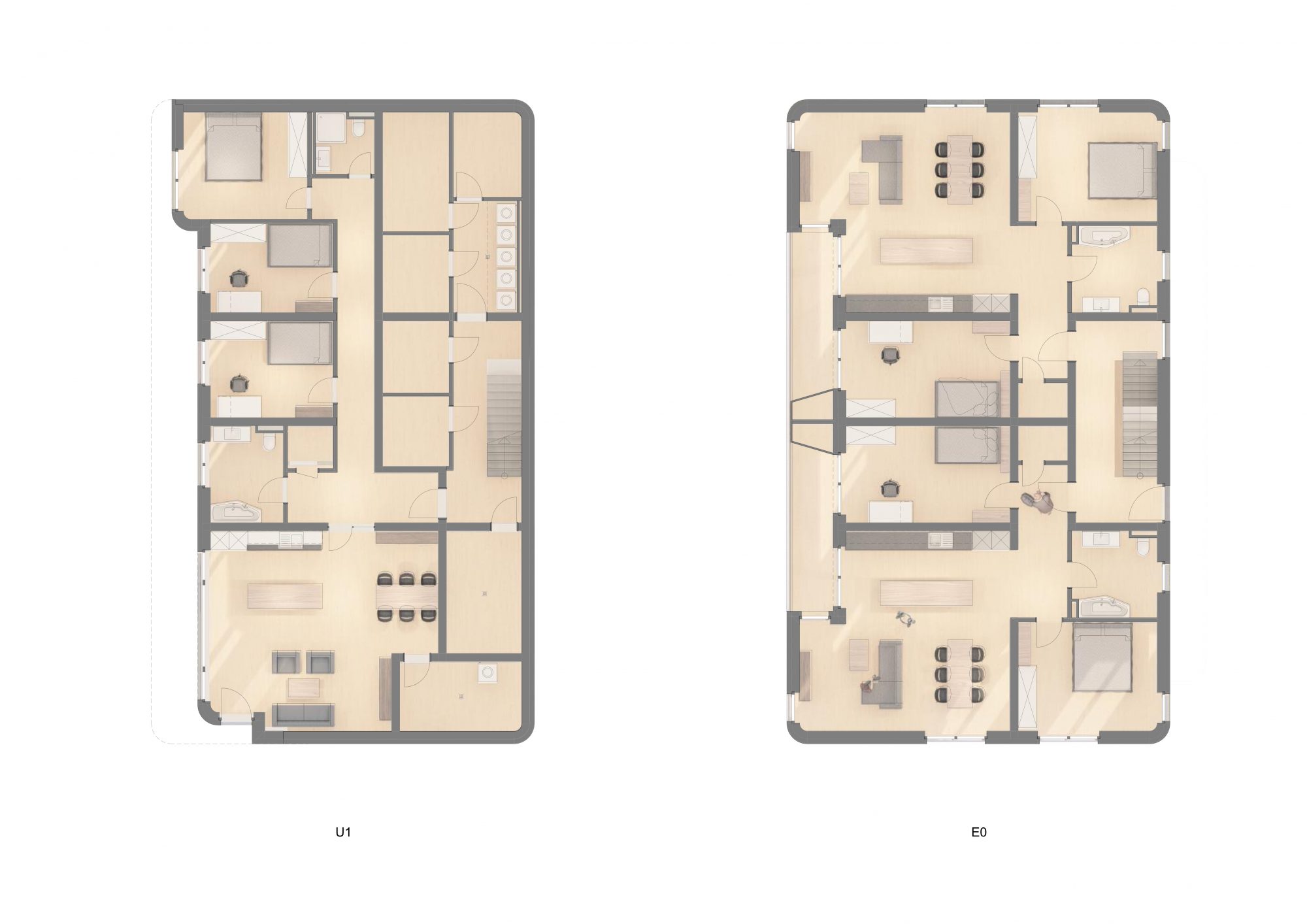 Dank der intelligenten Geländenutzung wirken die Gebäude zur Straße hin lediglich dreigeschossig, während im Untergeschoss großzügige Souterrainwohnungen entstehen, die mit angrenzenden Gärten begeistern. Sehr ansprechend sind die beiden Erdgeschosswohnungen mit eigenen Außenflächen, die zujm Entspannen und Verweilen einladen. Im ersten Obergeschoss bieten drei weitere Wohnungen im Maisonette-Design und großzügigen Balkonen zusätzlichen Wohnraum.